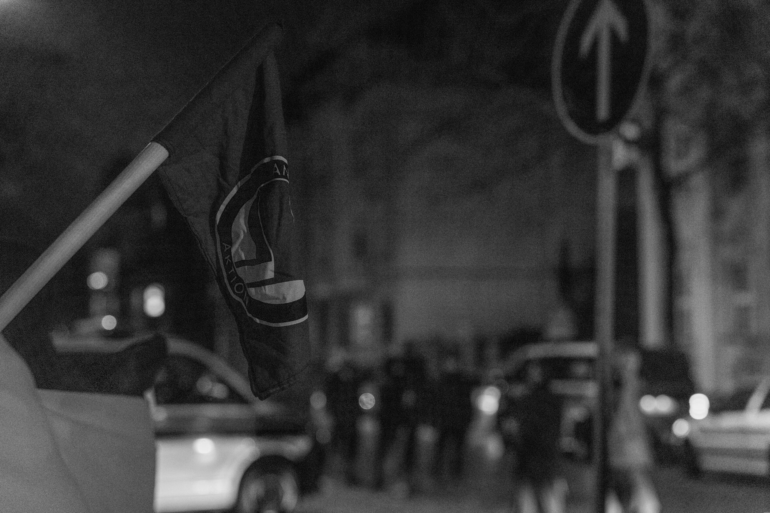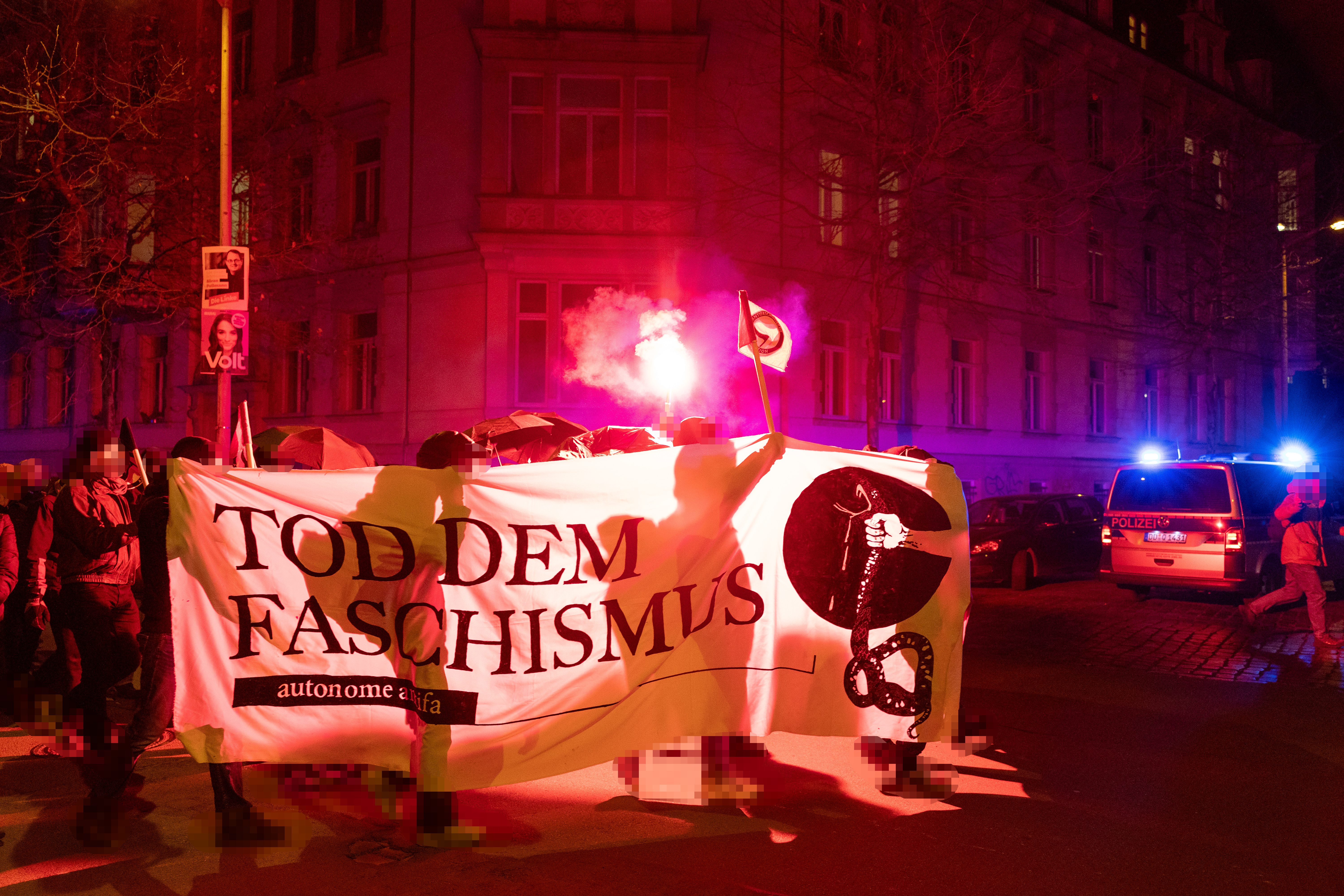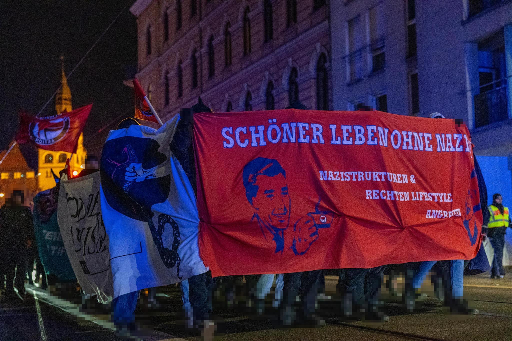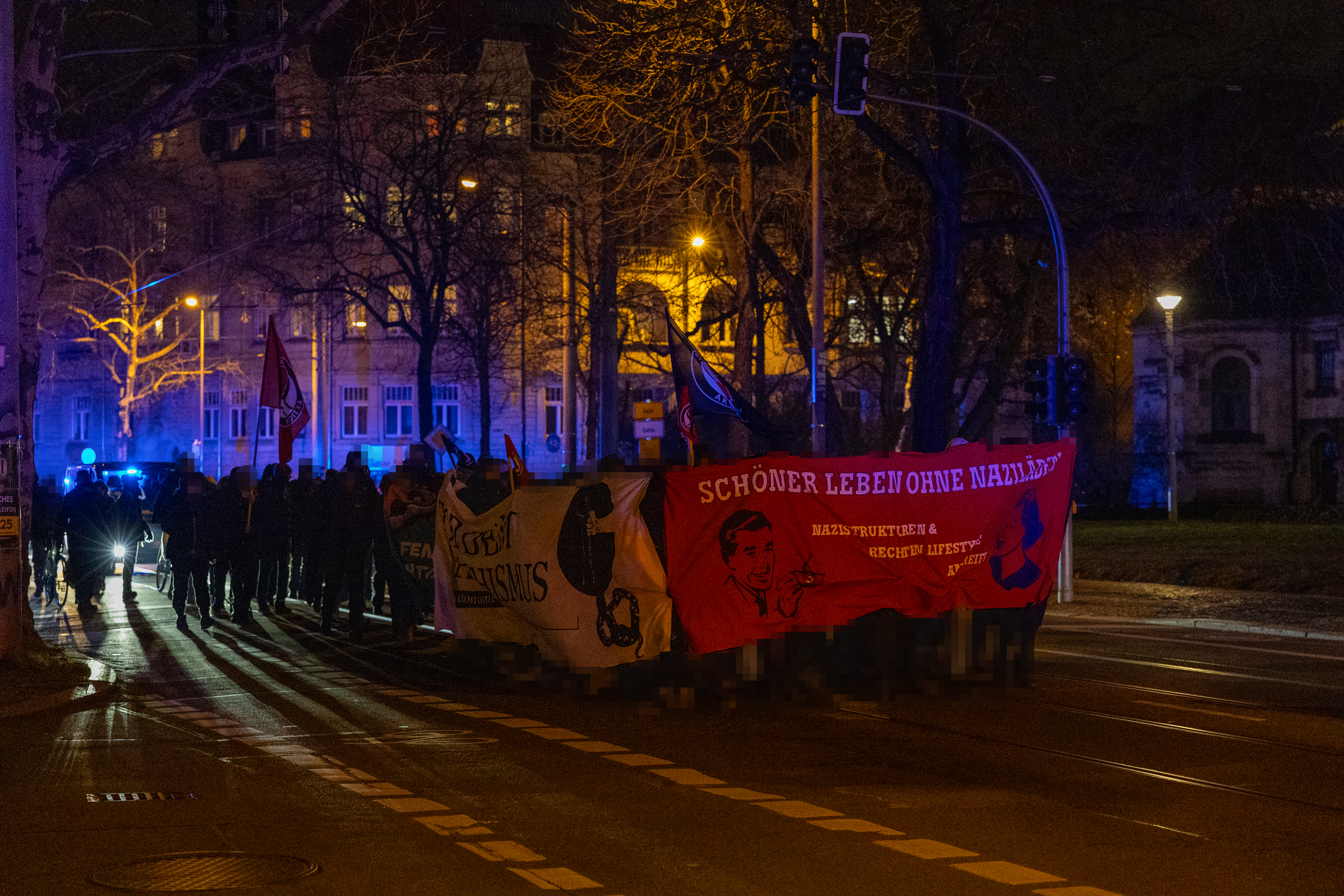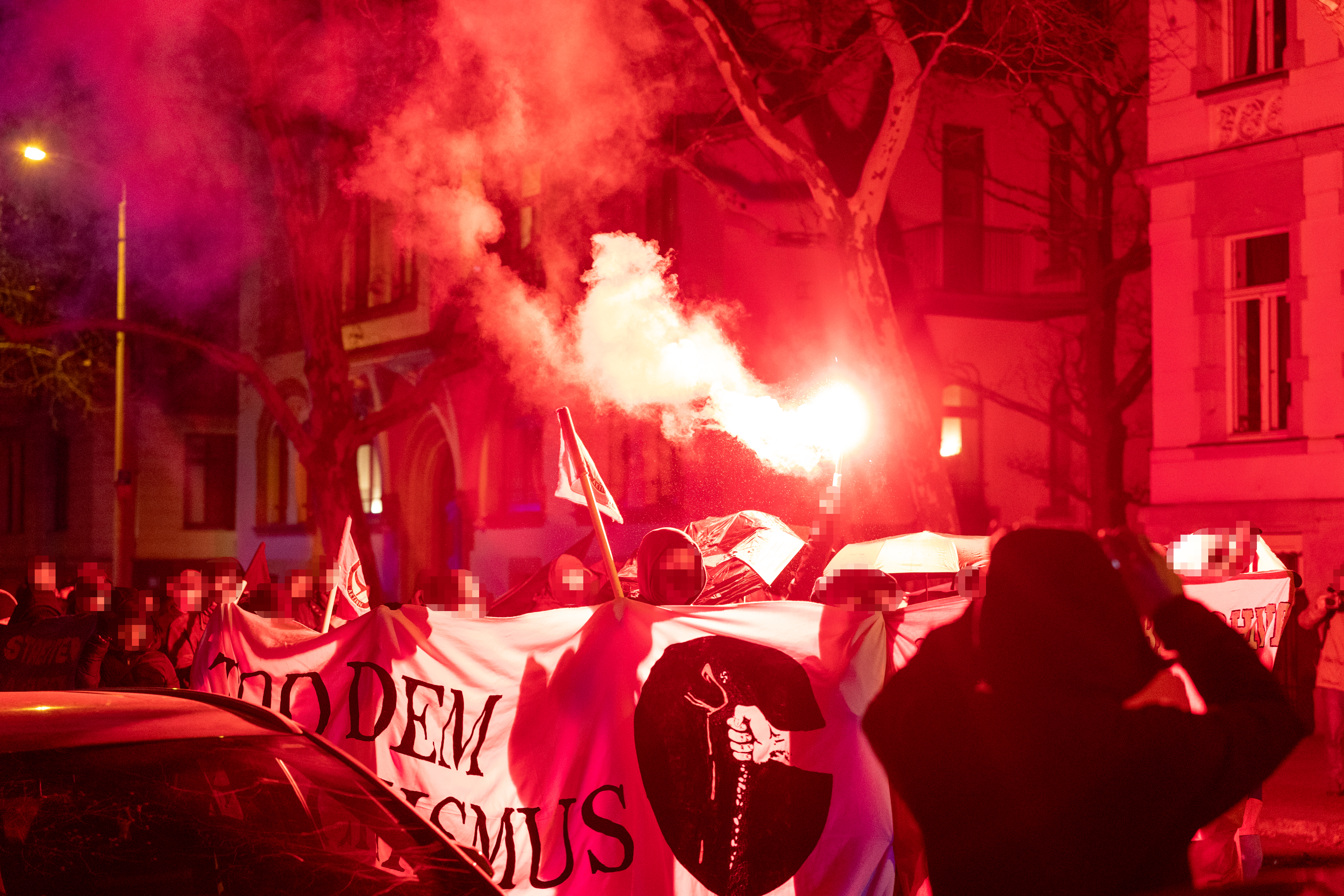Die 100 Teilnehmer*innen liefen zu einer zwischen Kundgebung vor das Haus von Tannwald Media, nach Sprechkören & mehreren Redebeiträgen zogen sie wieder zurück zum Naturkundemuseum.