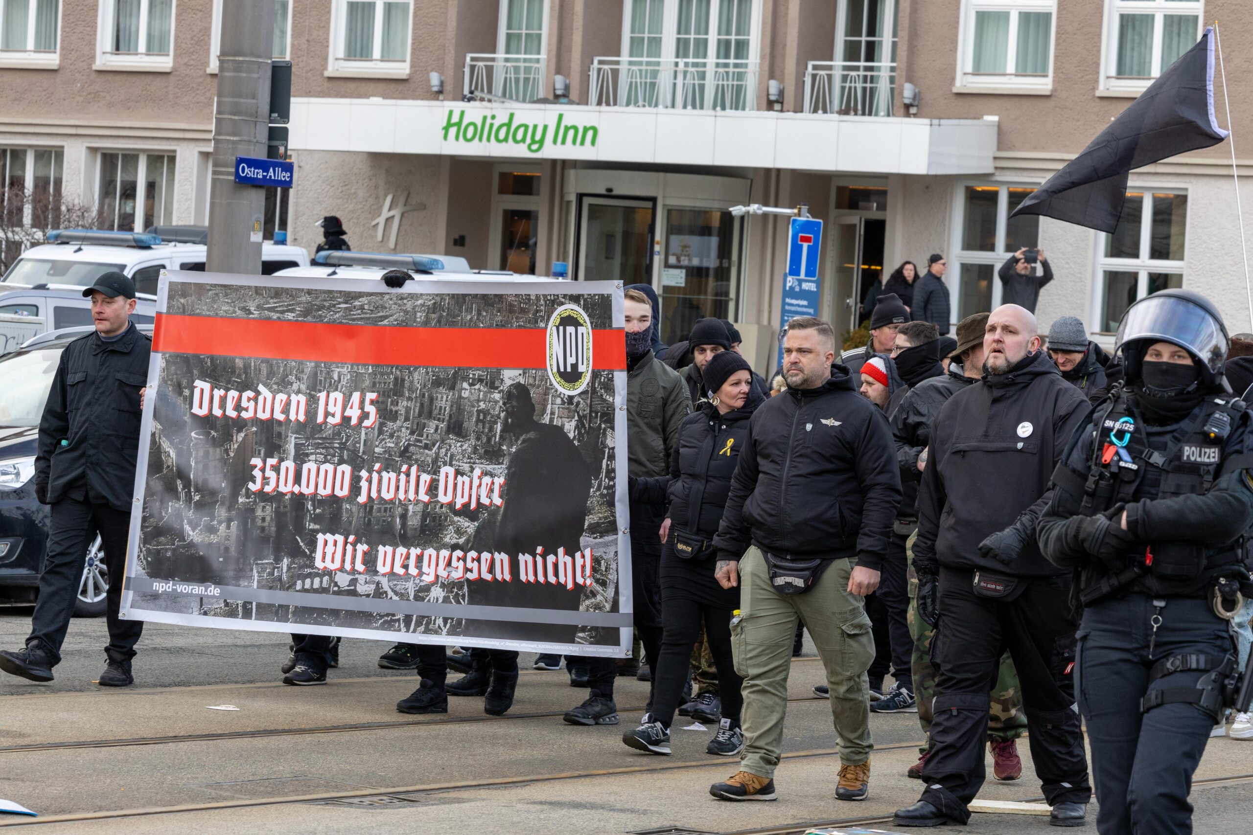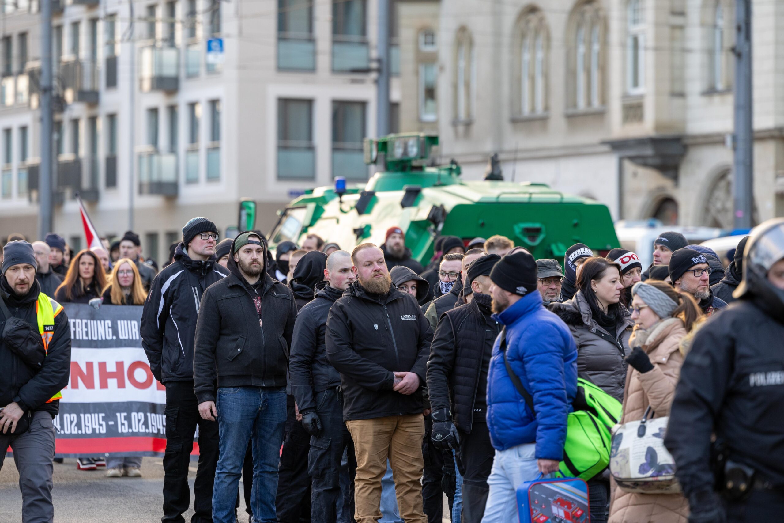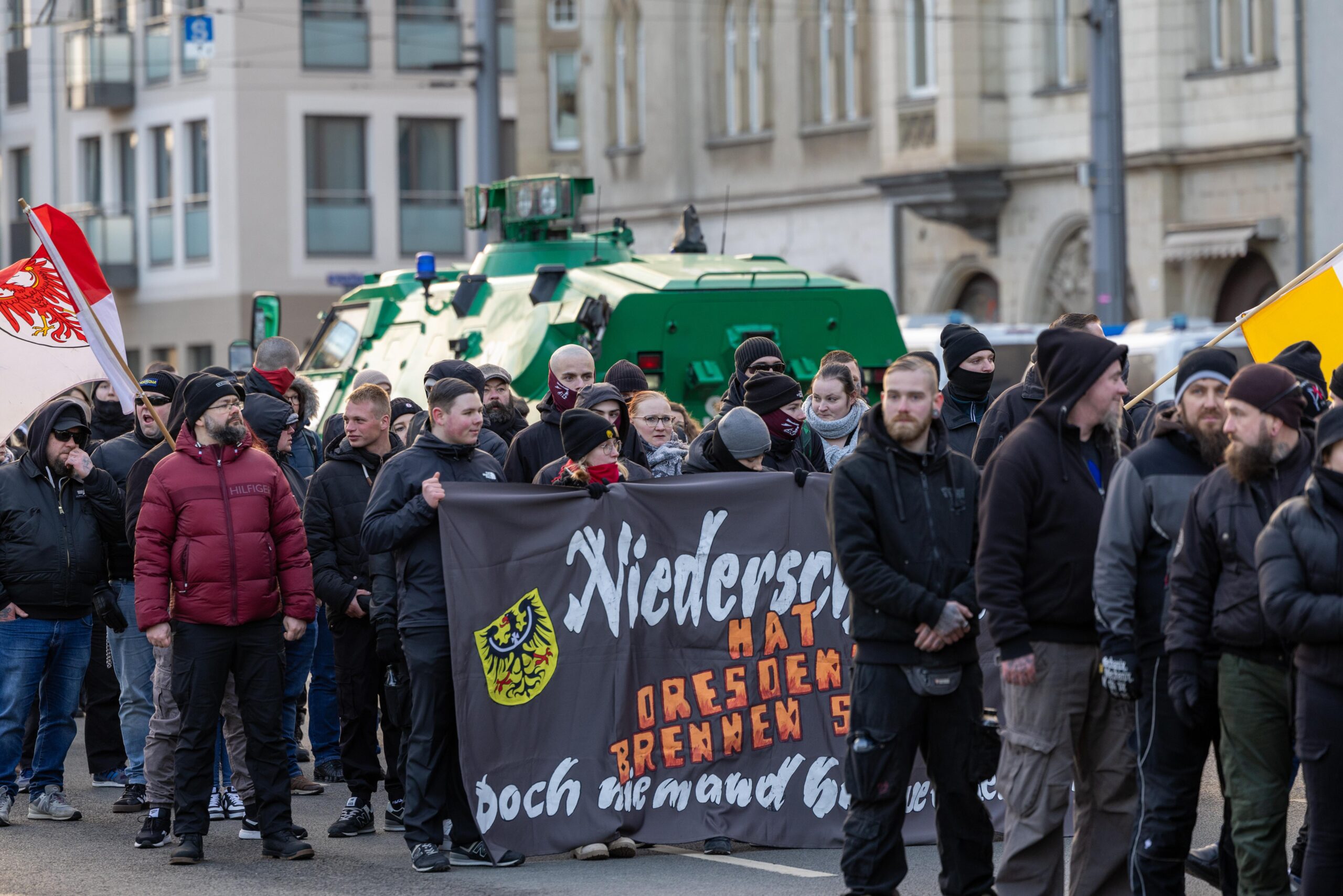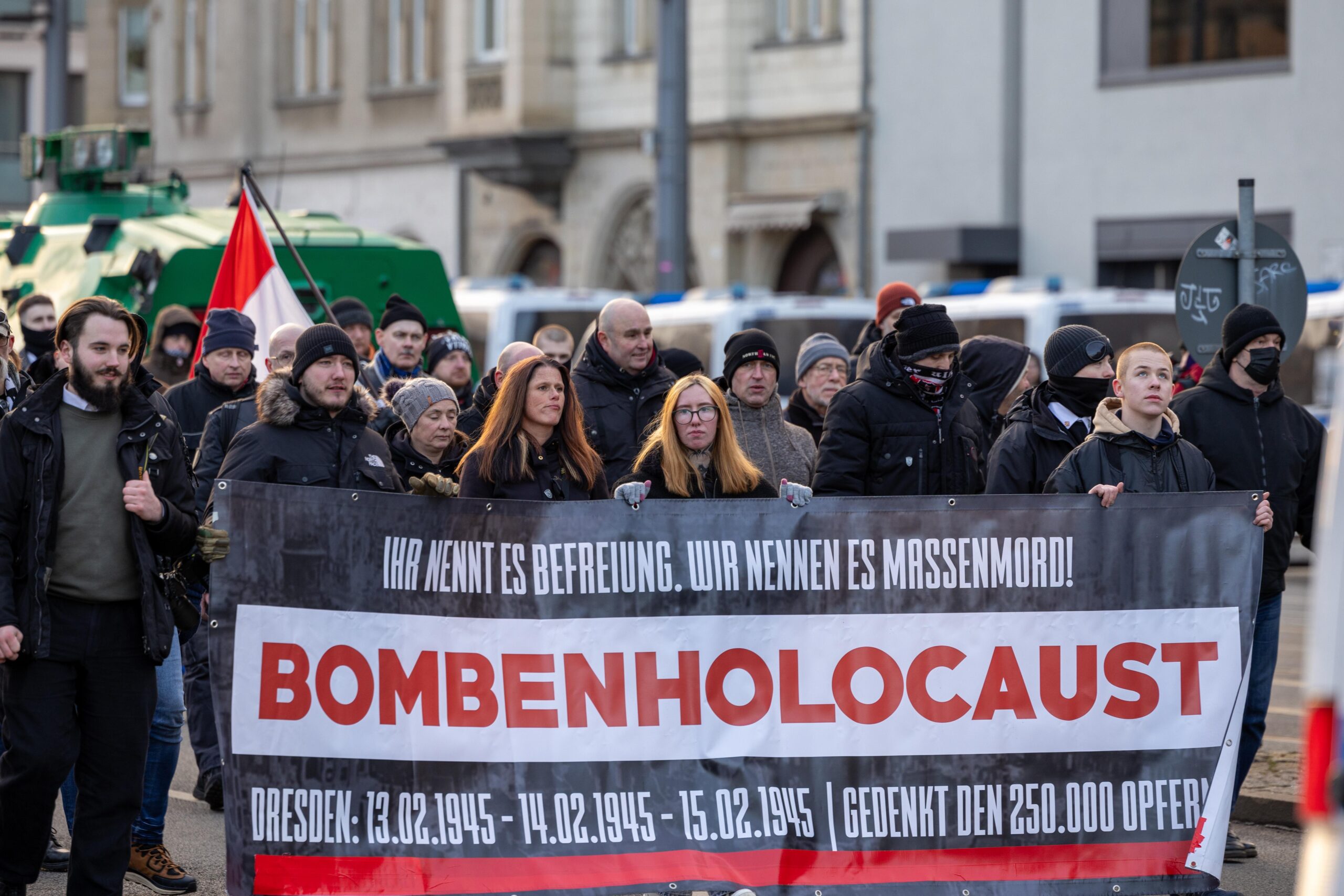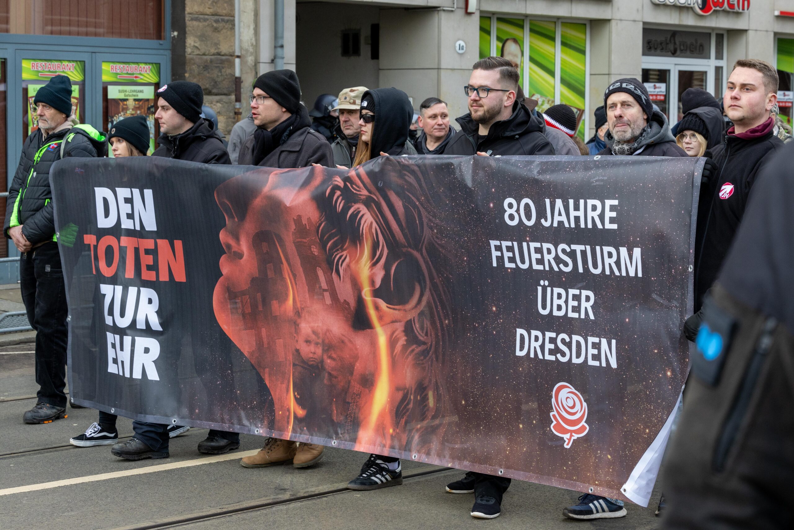 Zum 80. Jahrestag der Bombardierung Dresdens kamen Vertreter von „Die Rechte“, „Die Freien Sachsen“, „Die Heimat“ + deren Jugendorganisation „Junge Nationalisten“. Mitglieder der Active-Club-Szene die im Sommer letzten Jahres zu Störungen von CSD´s aufgerufen haben und bekannte Holocaustleugner!
