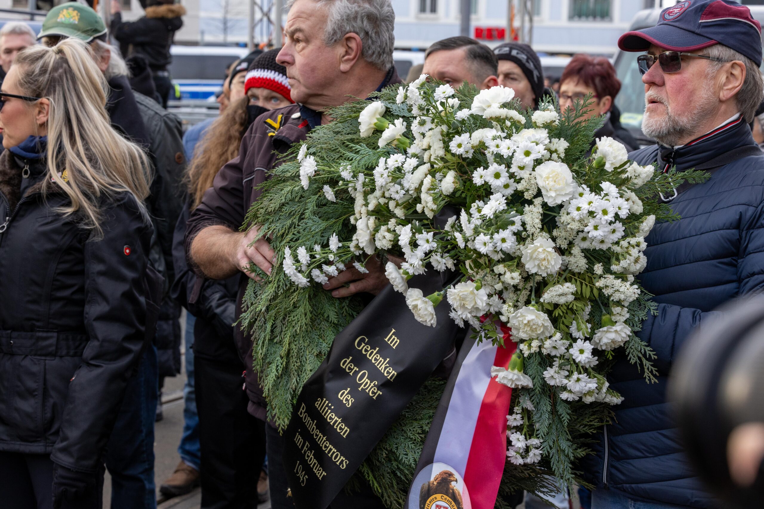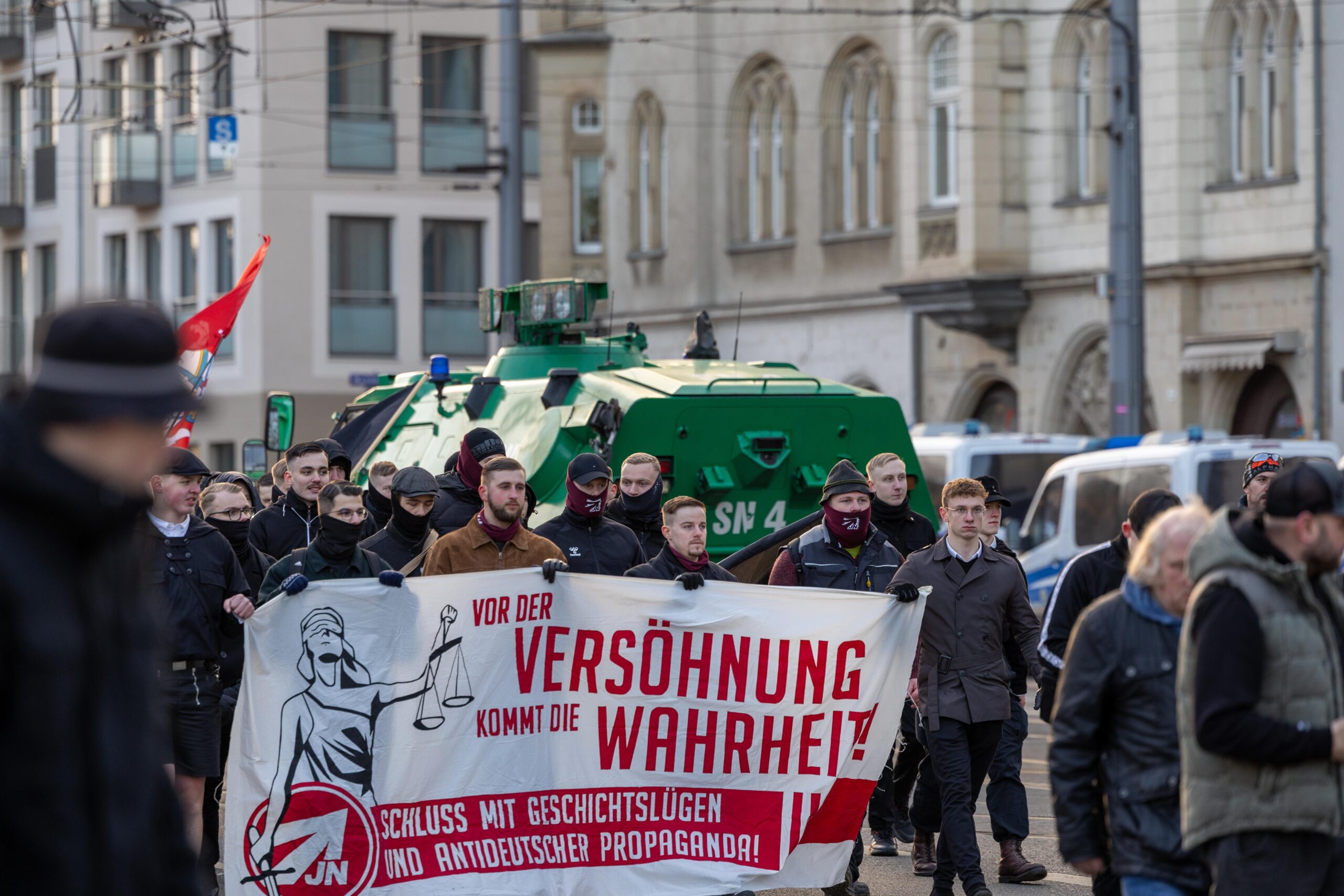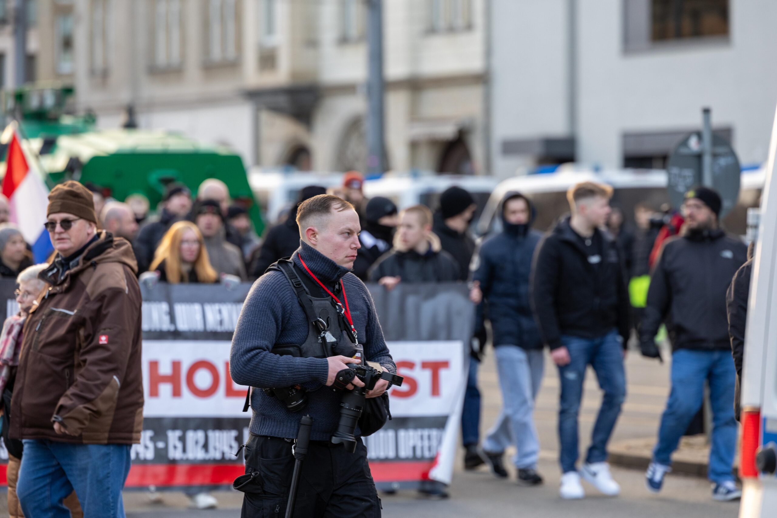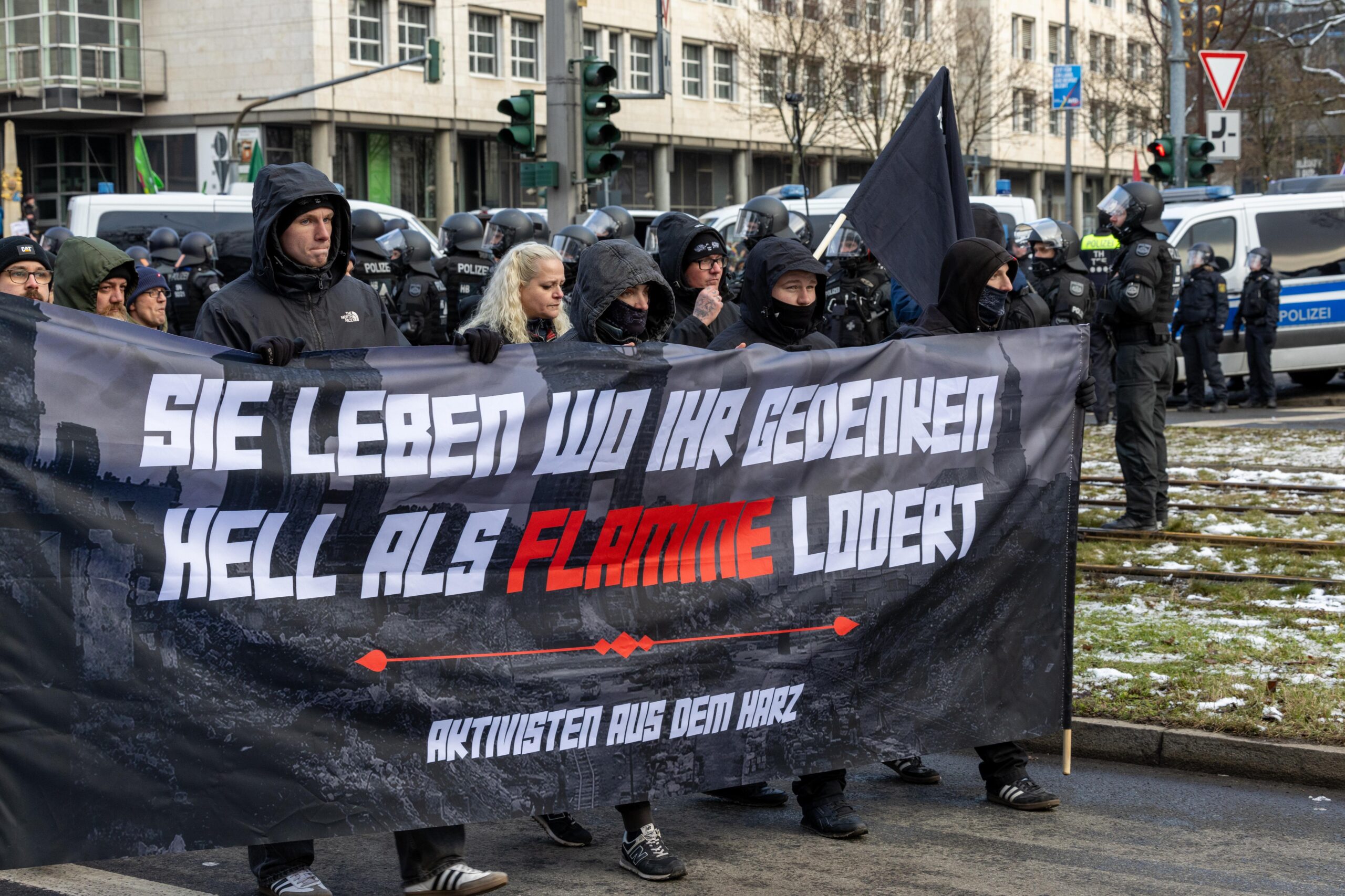 Zum 80. Jahrestag der Bombardierung Dresdens kamen Vertreter von „Die Rechte“, „Die Freien Sachsen“, „Die Heimat“ + deren Jugendorganisation „Junge Nationalisten“. Mitglieder der Active-Club-Szene die im Sommer letzten Jahres zu Störungen von CSD´s aufgerufen haben und bekannte Holocaustleugner!