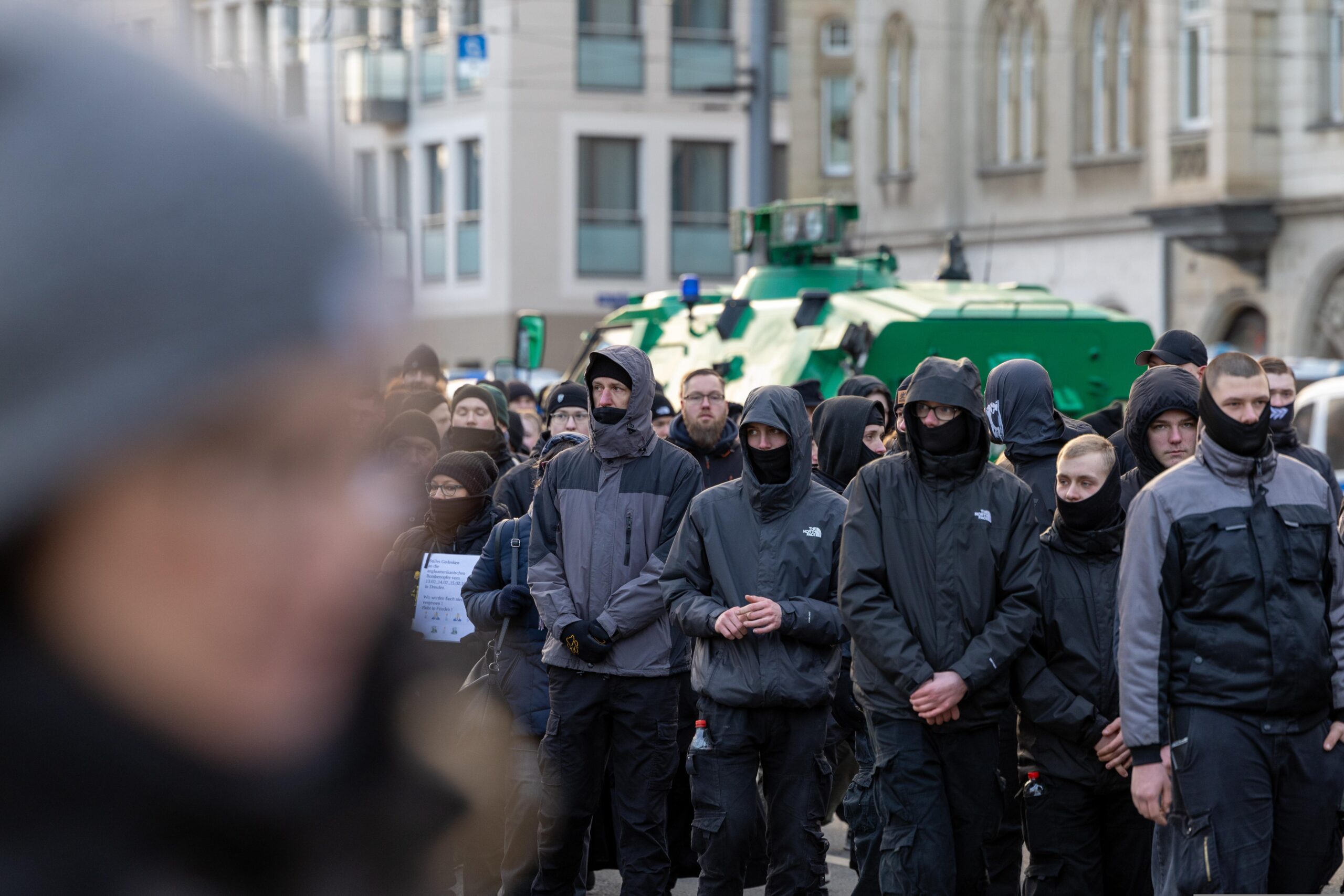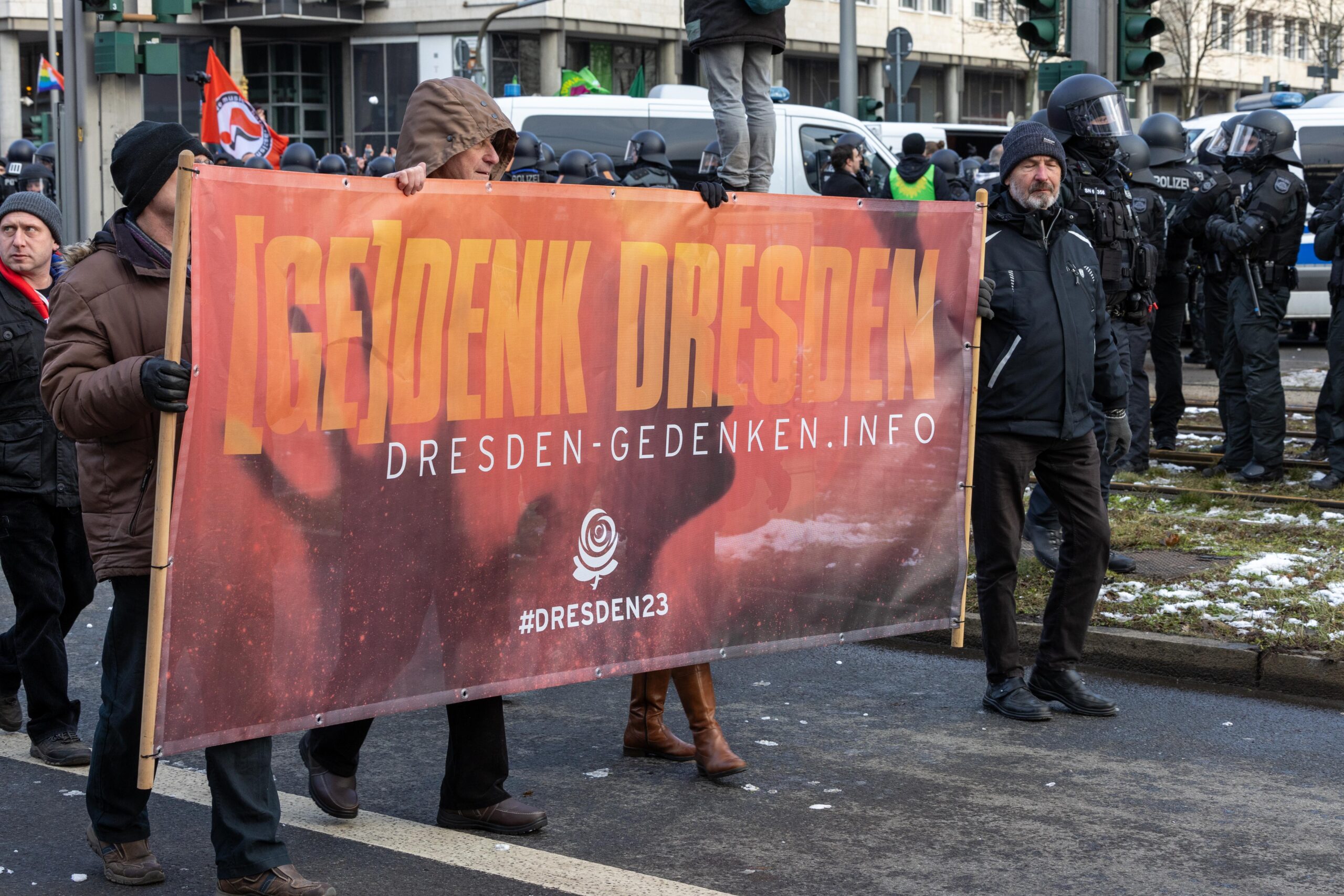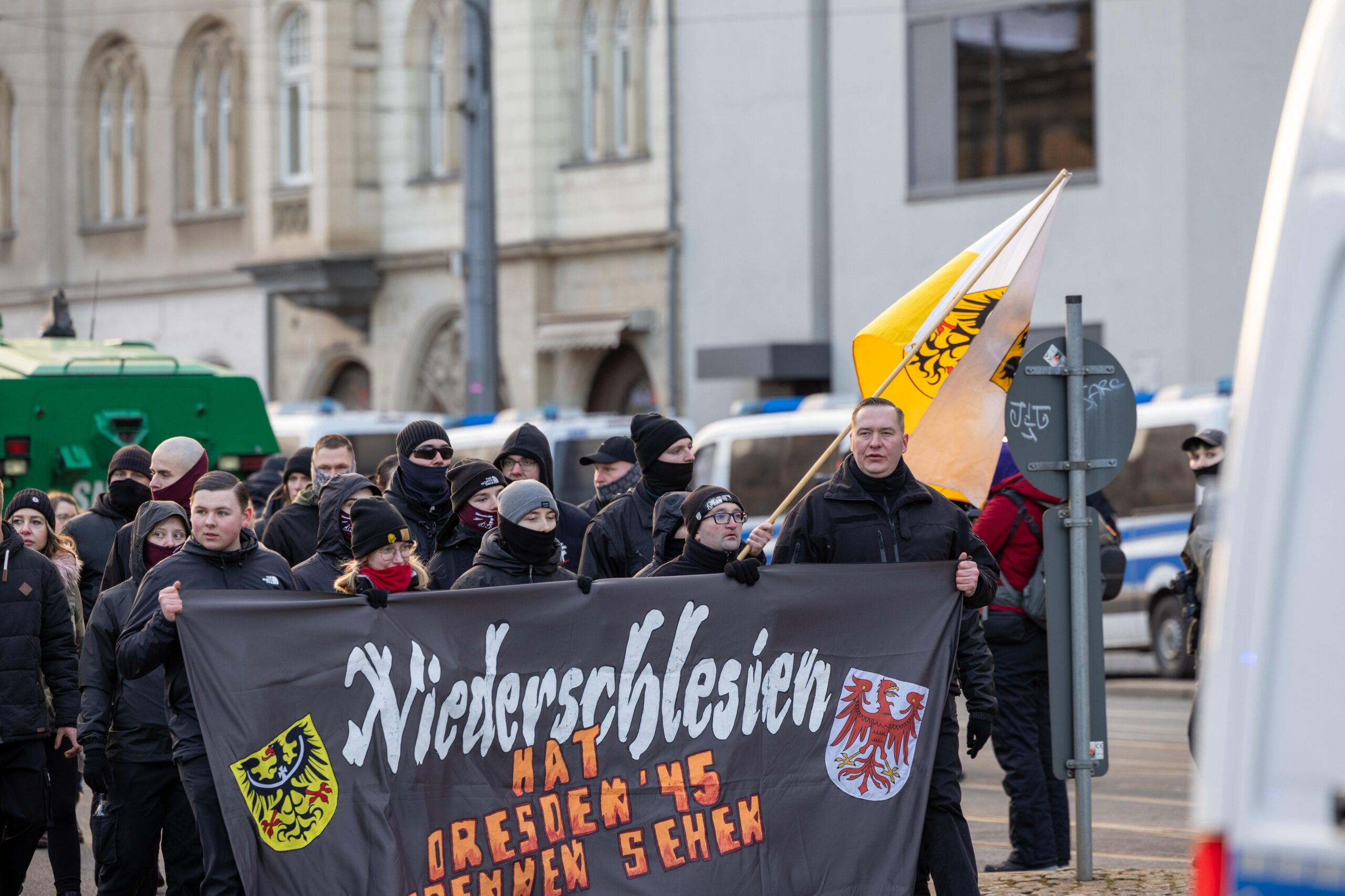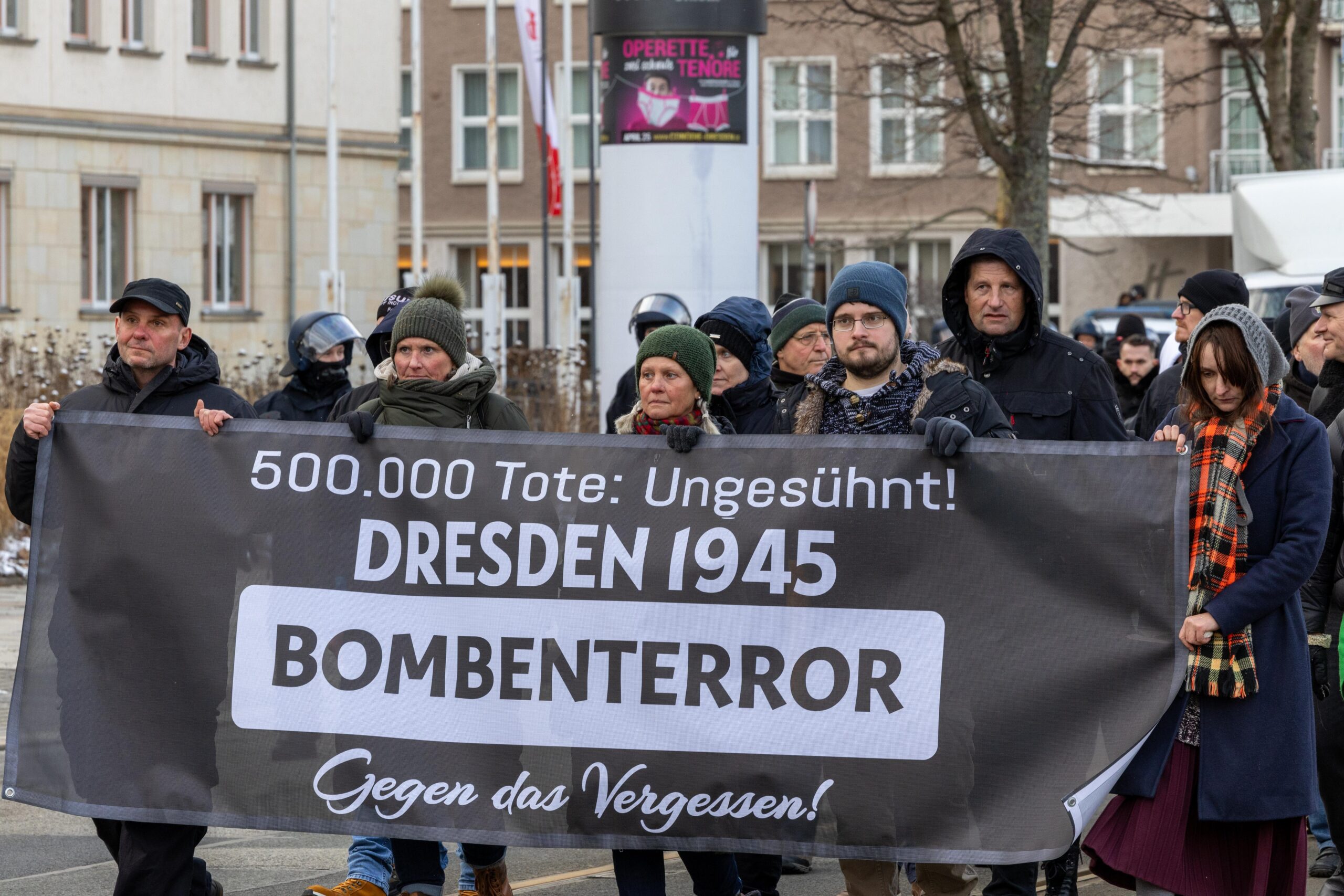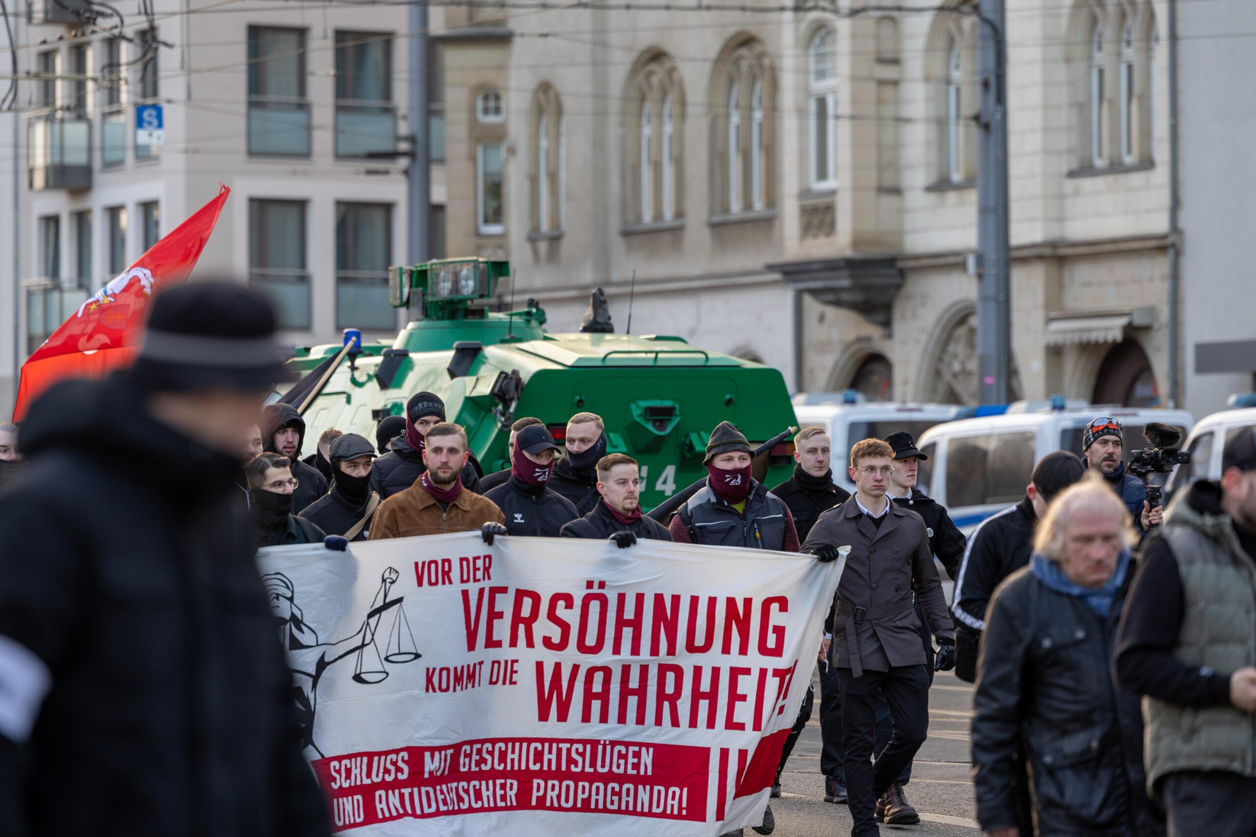 Zum 80. Jahrestag der Bombardierung Dresdens kamen Vertreter von „Die Rechte“, „Die Freien Sachsen“, „Die Heimat“ + deren Jugendorganisation „Junge Nationalisten“. Mitglieder der Active-Club-Szene die im Sommer letzten Jahres zu Störungen von CSD´s aufgerufen haben und bekannte Holocaustleugner!
